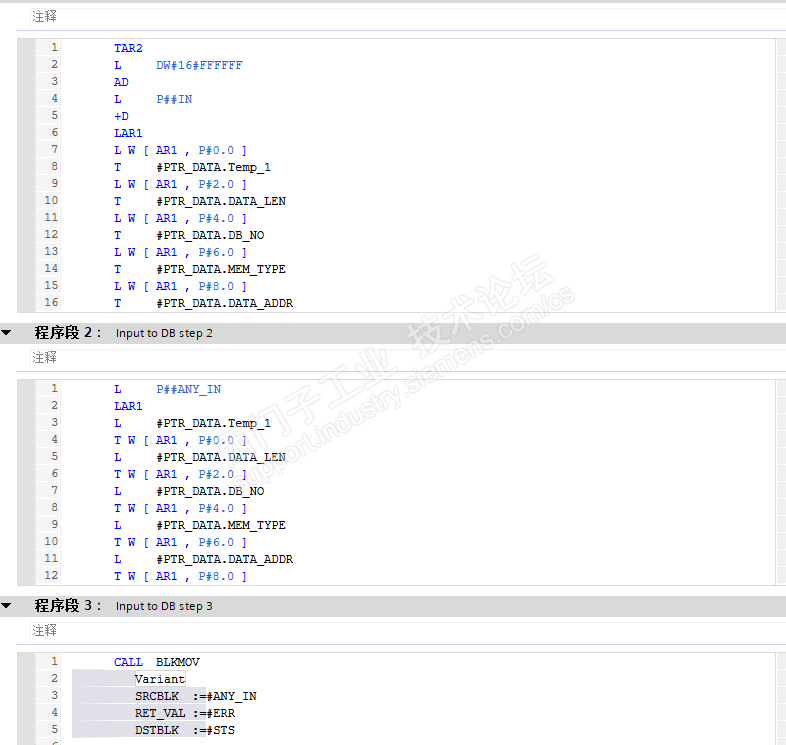 这段代码是西门子 S7-300/400 系列 PLC 的 STL(语句表)语言,作用是把一个“任意类型”的输入变量 #IN 拆成 5 个分量(Temp_1、DATA_LEN、DB_NO、MEM_TYPE、DATA_ADDR),再原封不动地拼回一个 ANY 指针 #ANY_IN,最后调用系统块 BLKMOV 把这段内存拷贝到目标区 #STS。
