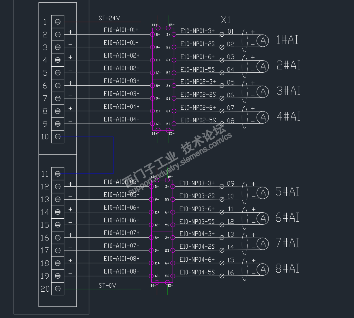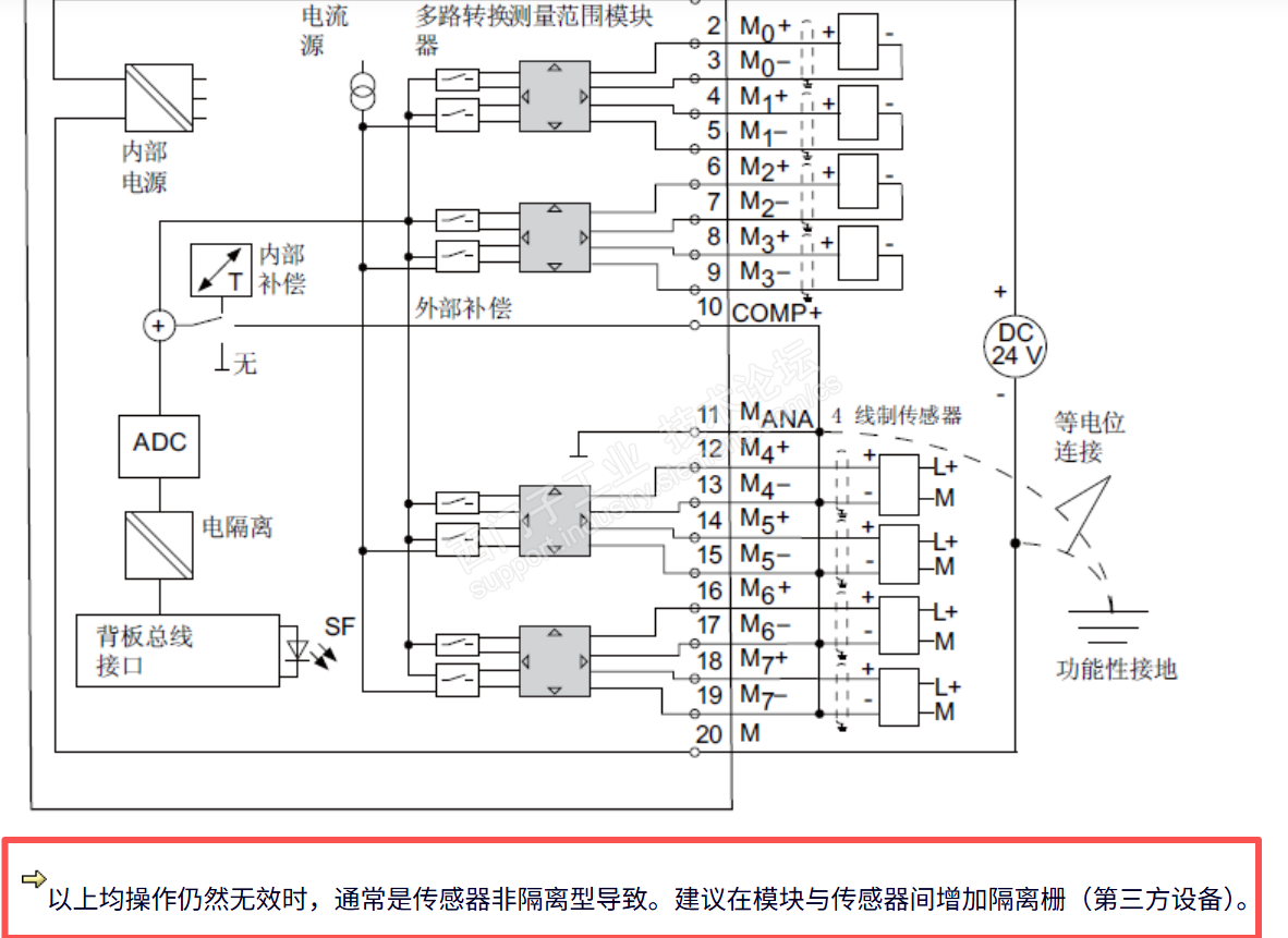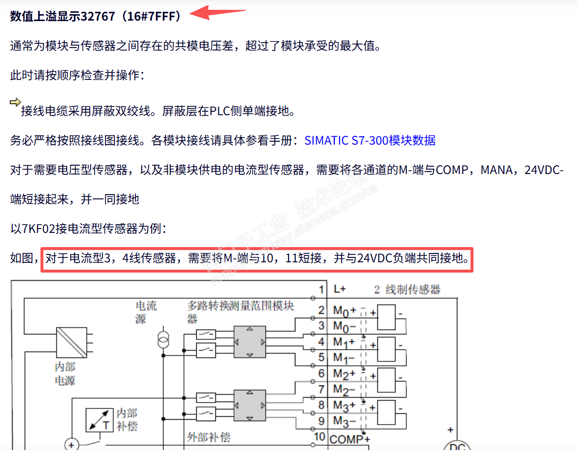 设备模拟量配置了安全栅,接线图如上。模块端子10/11短接了,信号-M-/24V-未与10/11短接。