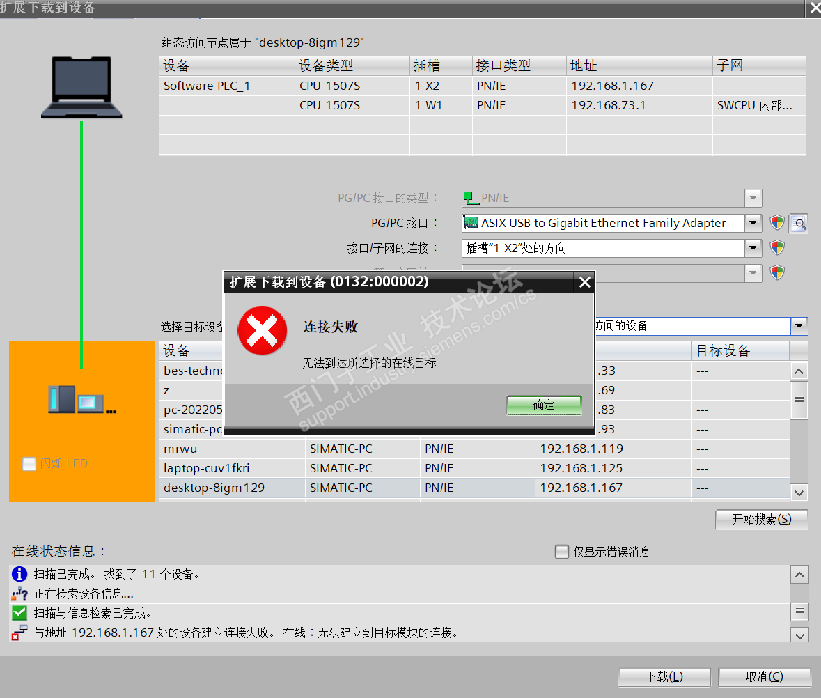 组态编译成功后选择下载,搜索可访问设备选择到确认的ip上,下载