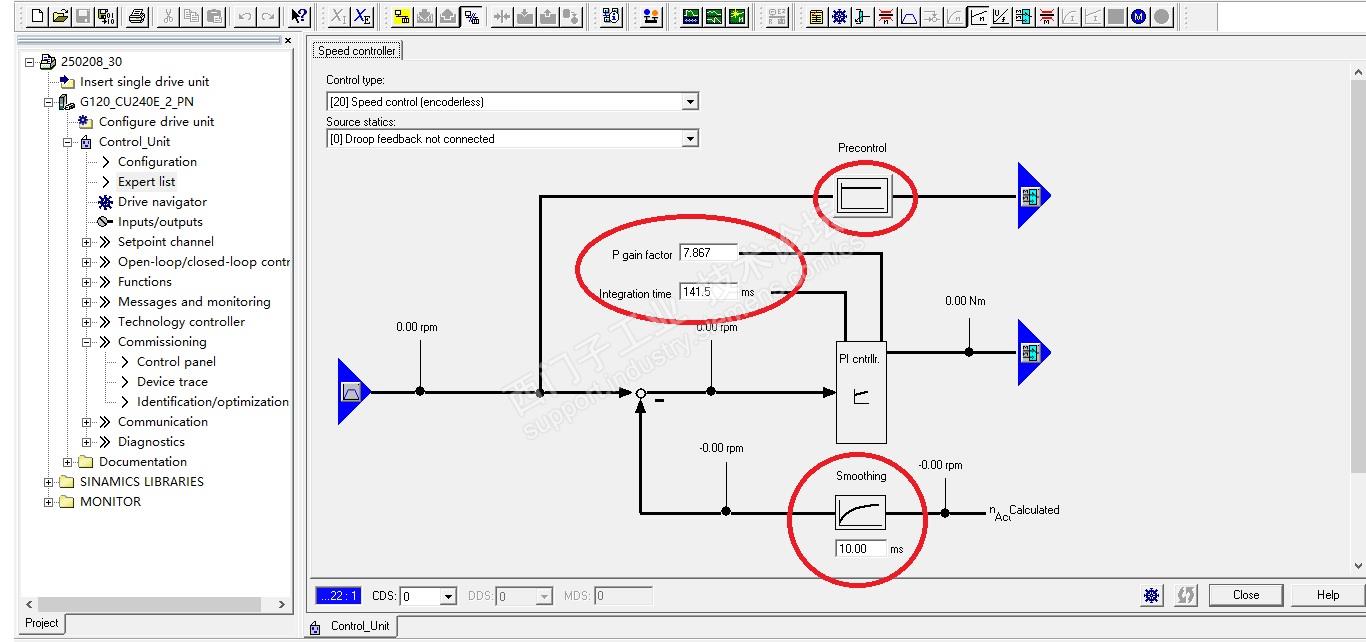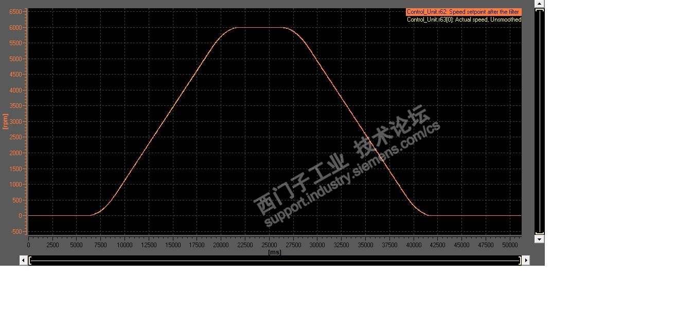 第一,执行快速调试流程。针对矢量控制的传动系统,动态自动辨识与计算是要做的。但执行完了P1900 = 1以后,完成全部的快速调试。要针对传动系统利用trace录波,将电机由0加速到最高转速的85%及以上,然后稳态运行,减速停车。将这个过程的转速设定值和转速实际值记录曲线做一个分析。确认后结束调试。