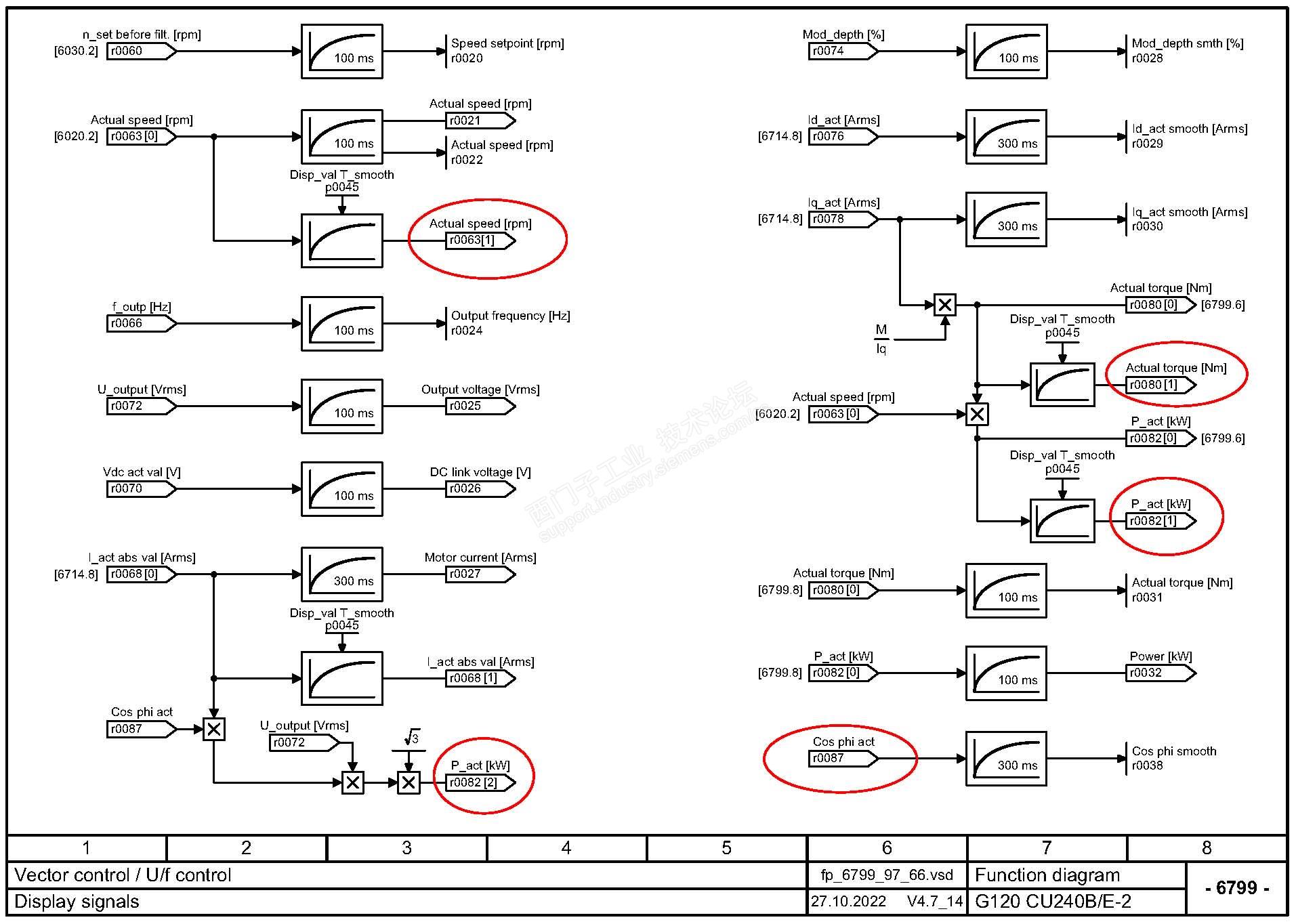 这张功能图来自G120的参数表手册,矢量控制最后一张。这张图,我经常在用。图中涵盖了所有矢量控制监控显示的重要参数。