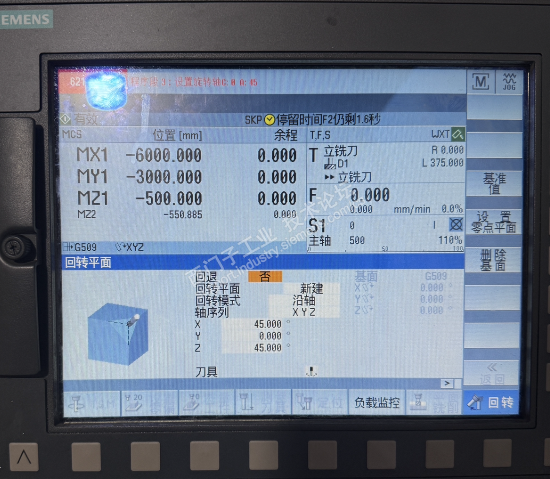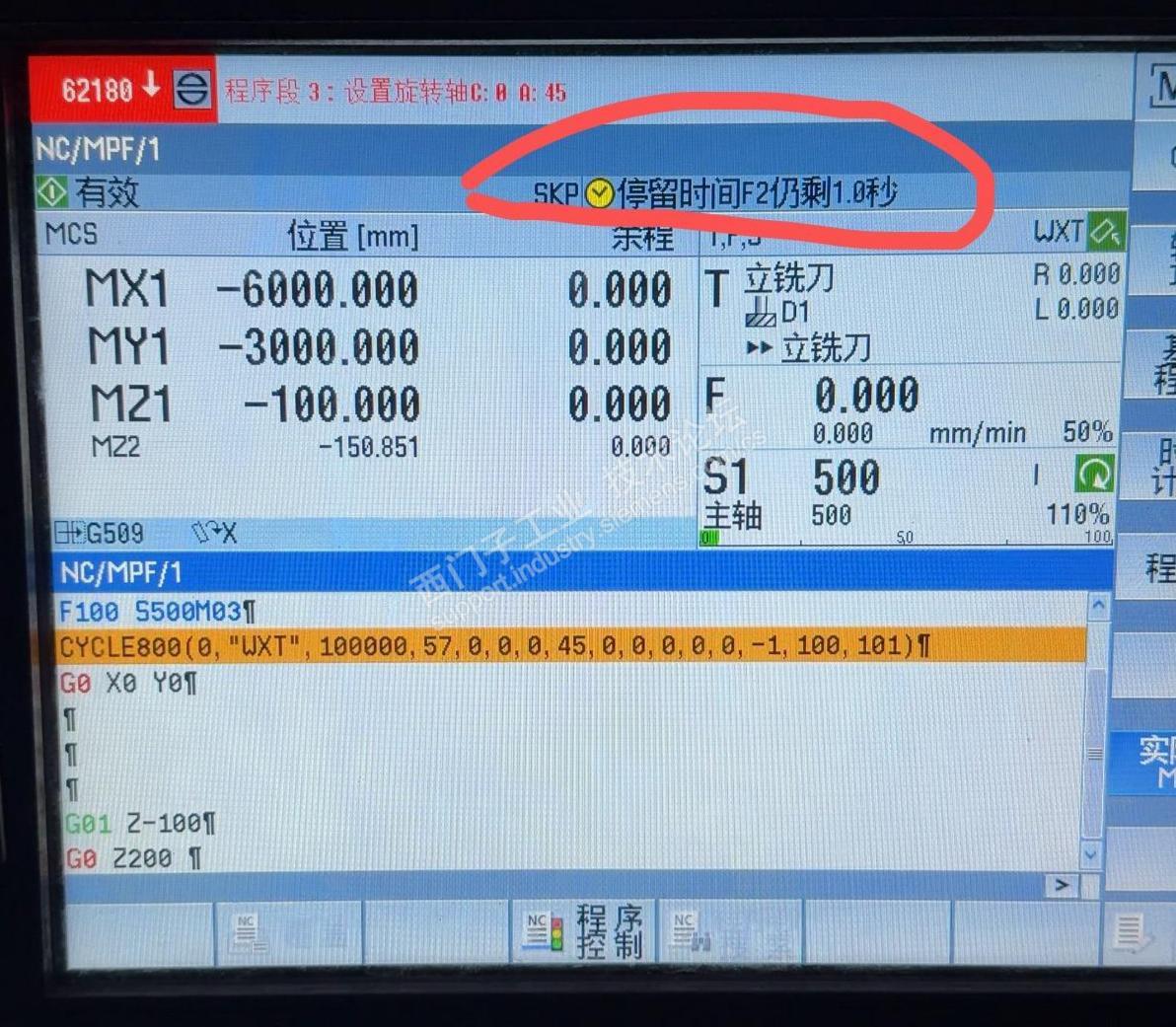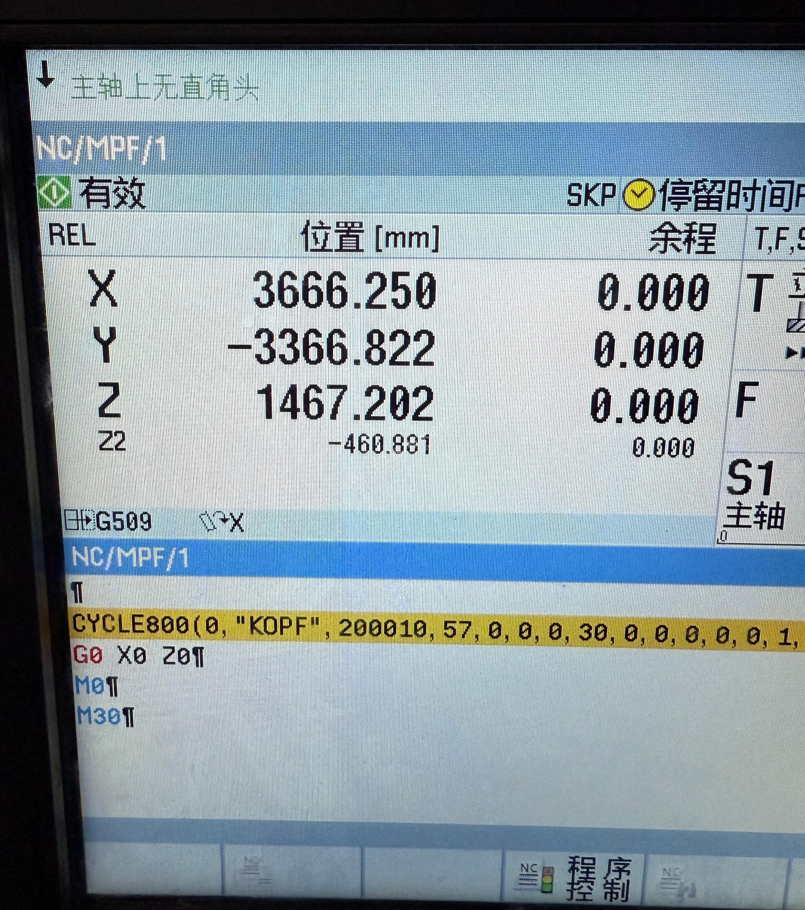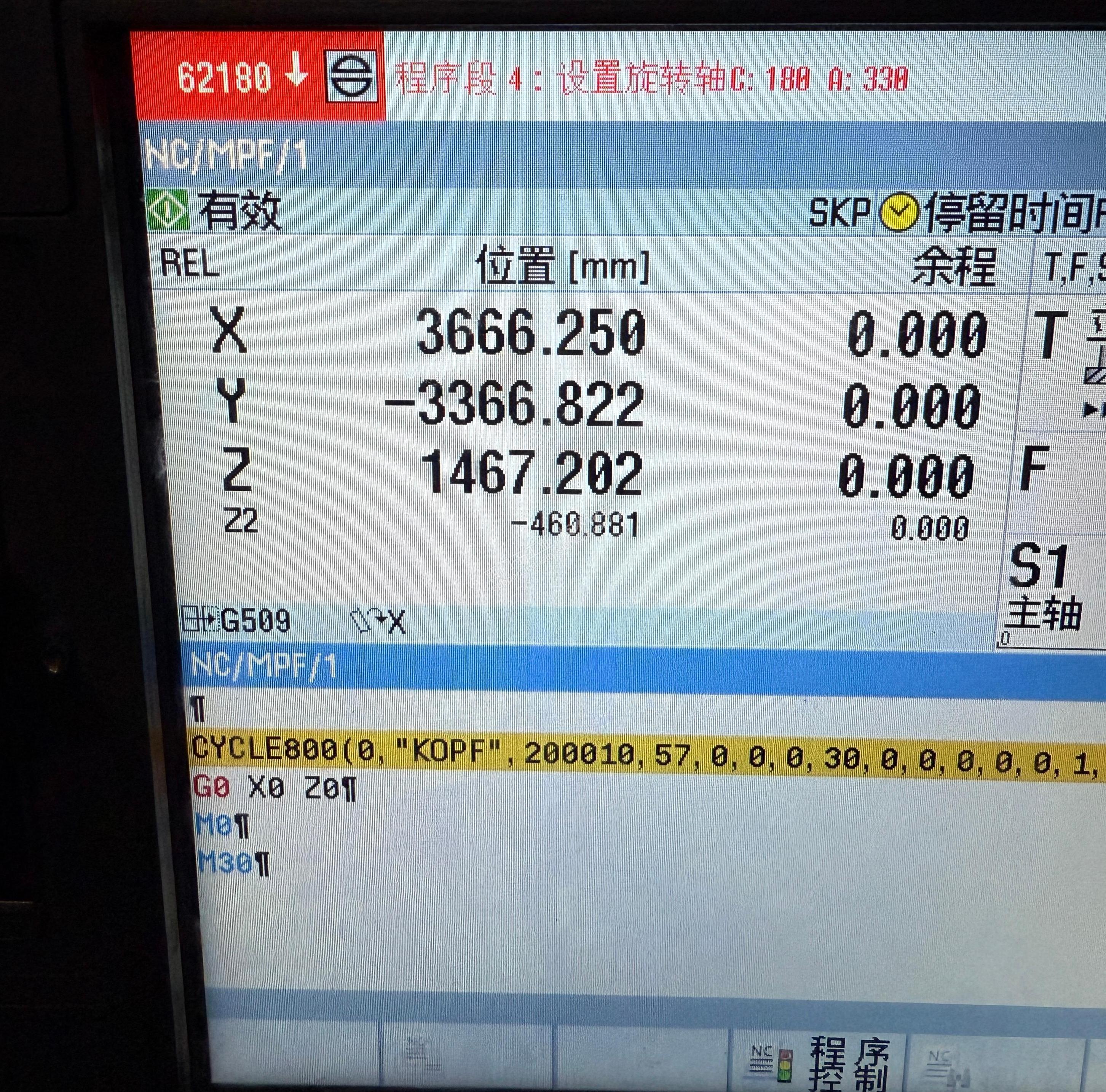 现在公司有一台西门子828D系统的龙门铣,手动附件头,有侧铣头,万向正交偏心角度头,也就是附件是靠螺钉固定在滑枕上的,角度旋转也是全手动完成。现在已经在调试--NC--坐标转换界面把TOOLCARR-刀架(典型)的参数正确设定了,在JOG界面的回转功能能正常使用,现在手动界面使用回转,再再MDI编写回转后的加工程序,能正常使用。可是在AUTO程序界面,我编写的一个程序,使用CYCLE800(),程序走到CYCLE就有个62180的报警,这个我知道,有个暂停功能,是提示手动转动附件到需要角度。机床还有个提示主轴上午直角头。按启动键,程序不执行CYCLE800下面的程序。屏幕上有个SKP停留时间F2任剩2秒,2秒到0秒一直滚动循环。反正就是按启动键不往下走程序。这是什么原因,大神帮分析一下,这是什么原因。