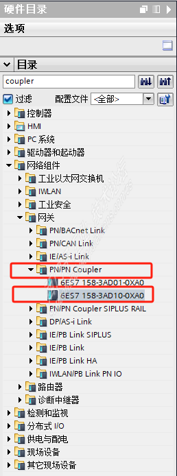 首先在项目-设备组态-右侧硬件目录中搜索COUPLER与NCU1740找到相应硬件,拖动到左侧网络视图中,