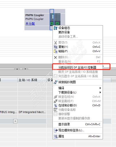 点选PN/PN Coupler X1接口,右键分配新的IO控制器,X1接口配给主机X150,同理X2接口分配给辅机X150