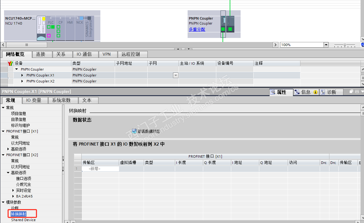 点选PN/PN Coupler X1模块,在下方的常规-模块参数-转换映射中设定相应IO映射:
