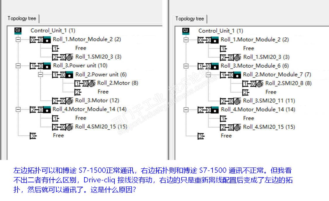 在调试 S120 时,用 Starter 对一个 CU320-2PN 先执行了自动组态并上传到 CU 中,经过 LED 闪烁确认与实际的电机模块一致,然后把博途中的电机名称复制到 Starter 中。后发现此 CU 与博途 S7-1500 通讯不正常,现场工程师没有动接线,只是重新离线配置修改了拓扑后就可以通讯了。我看了下修改前后的拓扑,只是组件号改变了,其它没什么变化。我就很纳闷这是什么原因?这些组件号应该都是 Starter 自动配置时自动生成的,博途中的报文顺序和组件号还有关系吗?请各位赐教,谢谢了。