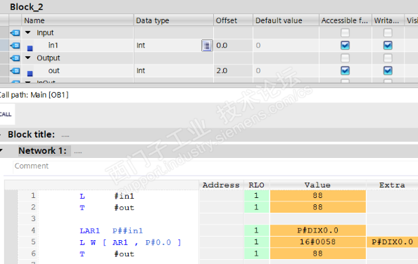 本FB块的功能是将输入传递给输出。我们可以用前2行符号寻址完成这个功能。也可以用后3行完成这个功能。既然能用符号寻址完成的功能,为什么还要用后3行的间接寻址完成这个功能?这是因为本例子旨在让大伙对地址存储器有一个初步的认识。对于AR来讲,更深入的用法是地址寄存器配合ANY指针的用法,由于这不是本篇所重点探讨的内容,所以ANY配合地址寄存器的用法不在这里讨论。