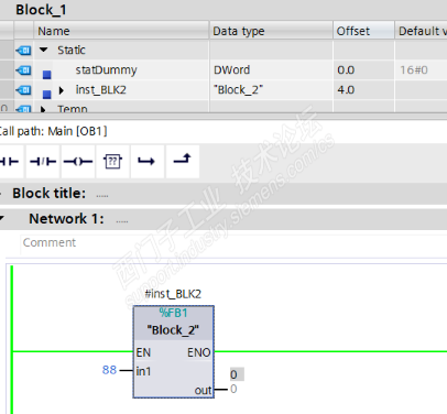 这里是重点:当CPU调用FB块时,CPU会将数据块中有关该FB所占用的数据区的起始地址自动赋值给AR2。在BLOCK_1的背景数据块中,BLOCK_2的起始地址是4.0。这一点在图2.1中变量声明区就可以知晓了。
