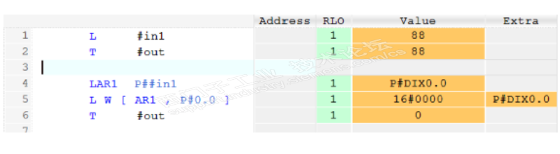第4行含义:将in所在的背景数据块偏移量传输给AR1,内容是P#DIX0.0。这有2个信息:1,指针指向背景数据块(DI);2,in存储在偏移量是0.0的地址中。