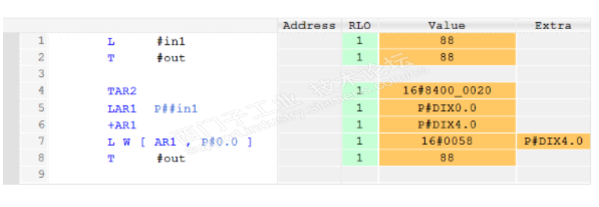 LAR2 //将累加器1中的内容赋值给AR2。为了看清AR2或者累加器1中内容,我们增加了这行。有了这行我们知道累加器1中的内容和AR2中的内容是P#DBX4.0,P#DBX4.0与16#8400_0020是相同的值,只是表示法不同。一个用指针表示,一个用16进制表示。