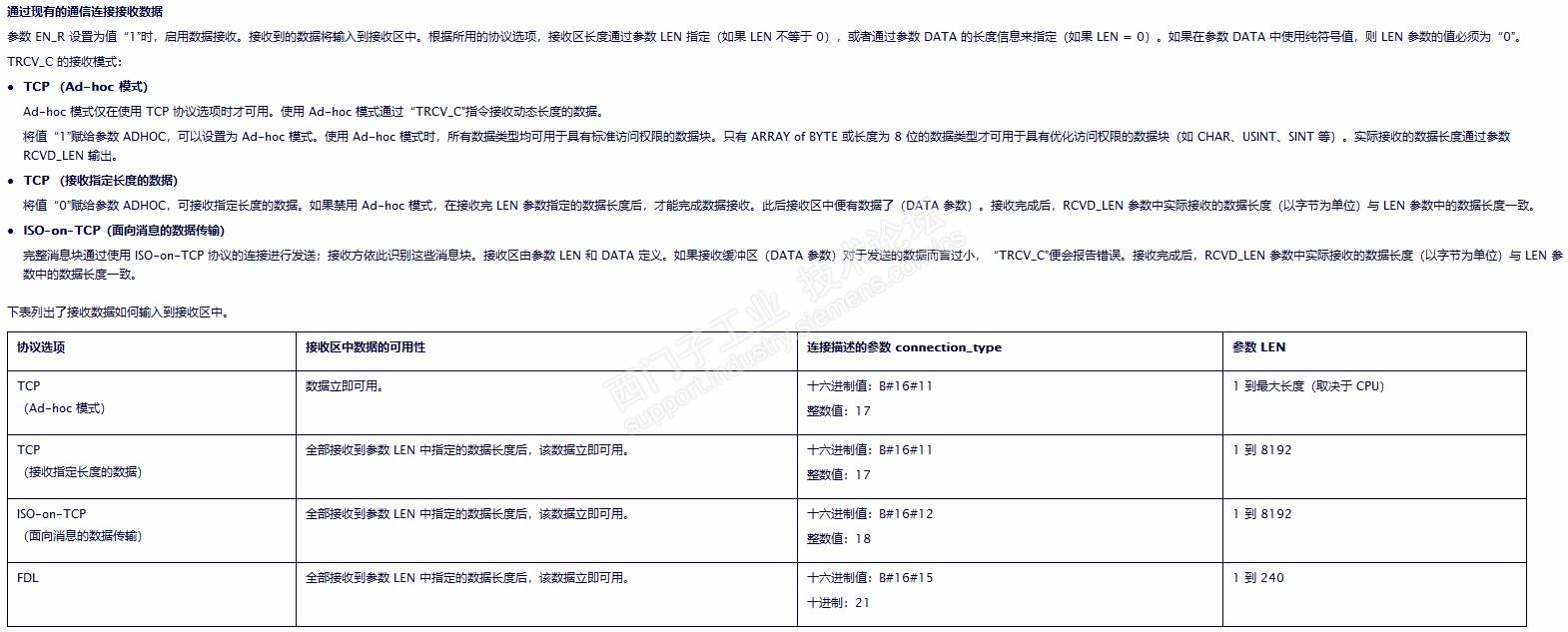 最近在学习西门子1200 TCP/IP 通信, 在关于连接的定义里面,有一个ConnectionType是定义连接类型的,默认是16#0B,后面的注释说明 16#0B, 也就是十进制的11 是TCP/IP , 19 是UDP , 后面又来了一个括号 17=TCP/IP, 在关于指令的帮助里面,又提到还有18和21, 那这个地方,到底应该设为多少啊?感谢大神,谢谢。对了, 还有那个LEN引脚的定义也不清楚,引脚本身定义为:要接受数据的最大长度。其他地方又提到,全部接收到参数LEN中指定的数据长度后,该数据立即使用。举个例子,如果是非优化块,LEN设定为100, 但是我实际只发送了60个自己,是不是就认为没有接收完成啊,谢谢大神,这个地方有点深奥,恳请大神给与指明,谢谢