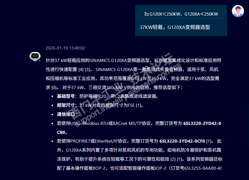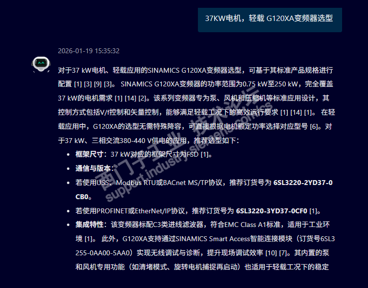 尝试让AI小西选一个G120XA的变频型号,输入信息要求37KW 轻载,结果出来的是75KW的变频订货号,输入信息加个电机,推荐出个错误的订货号,看来AI小西还得加强训练。