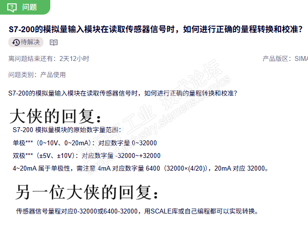 各位大侠:今天,我浏览“找答案”这个栏目,看到一个问题:S7-200的模拟量输入模块在读取传感器信号时,如何进行正确的量程转换和校准?我看到几位大侠的回复:如截图所示