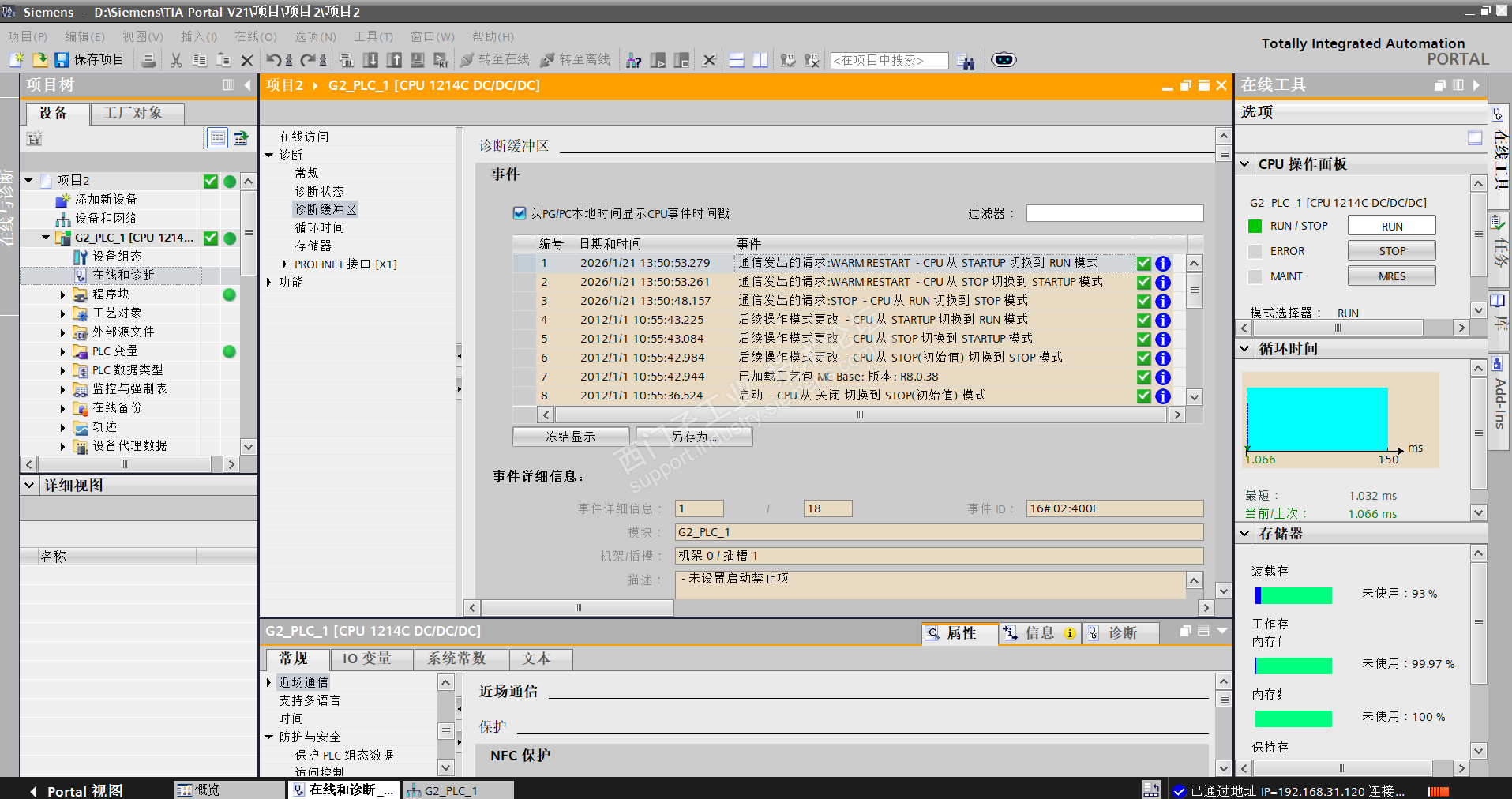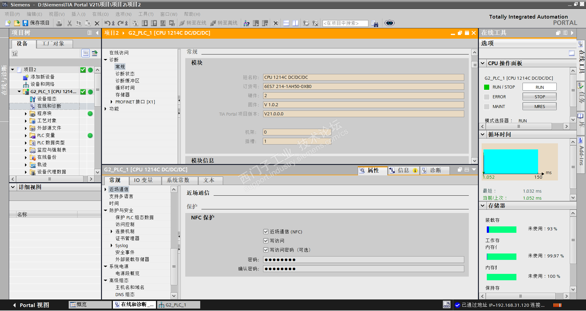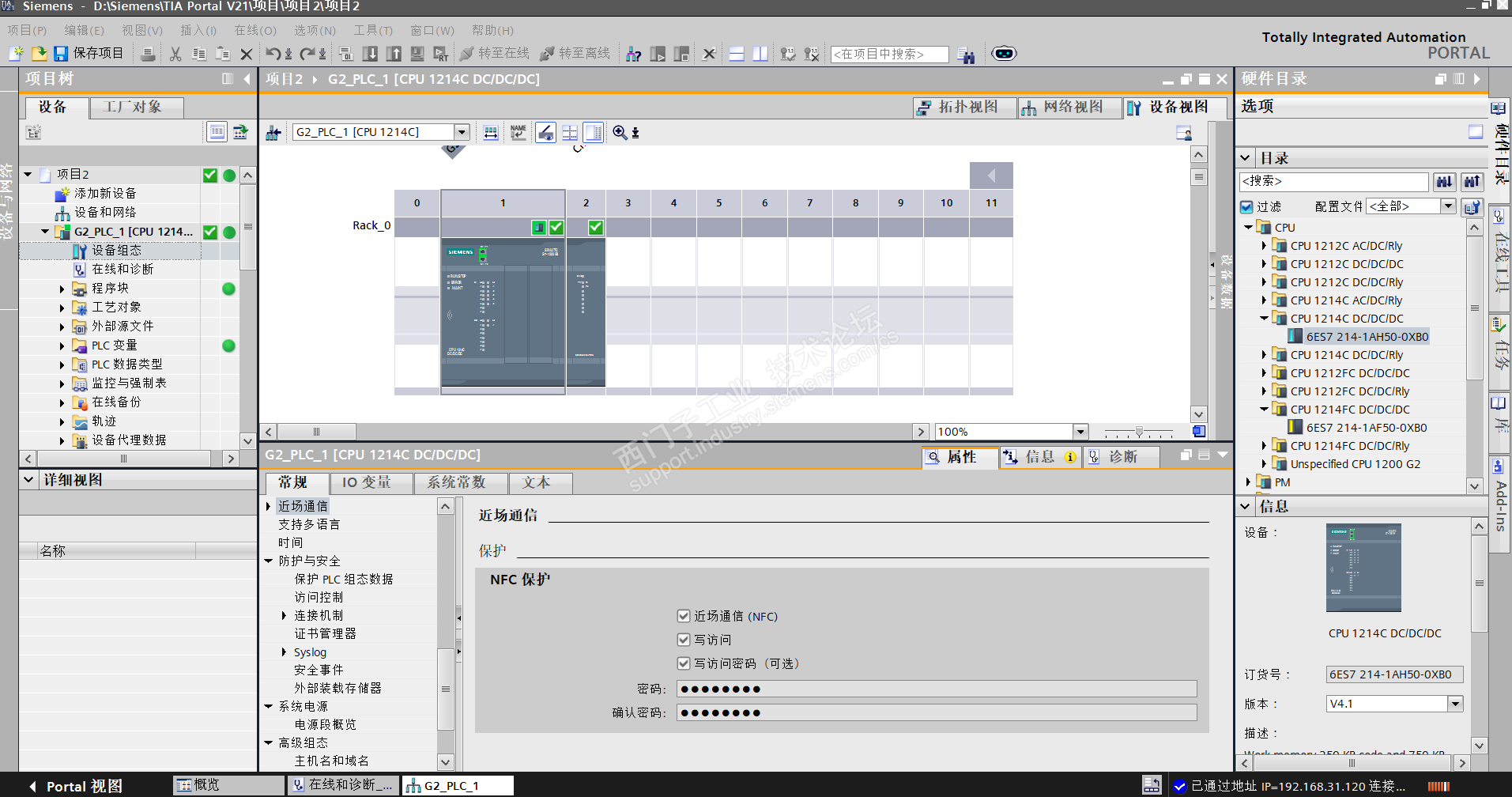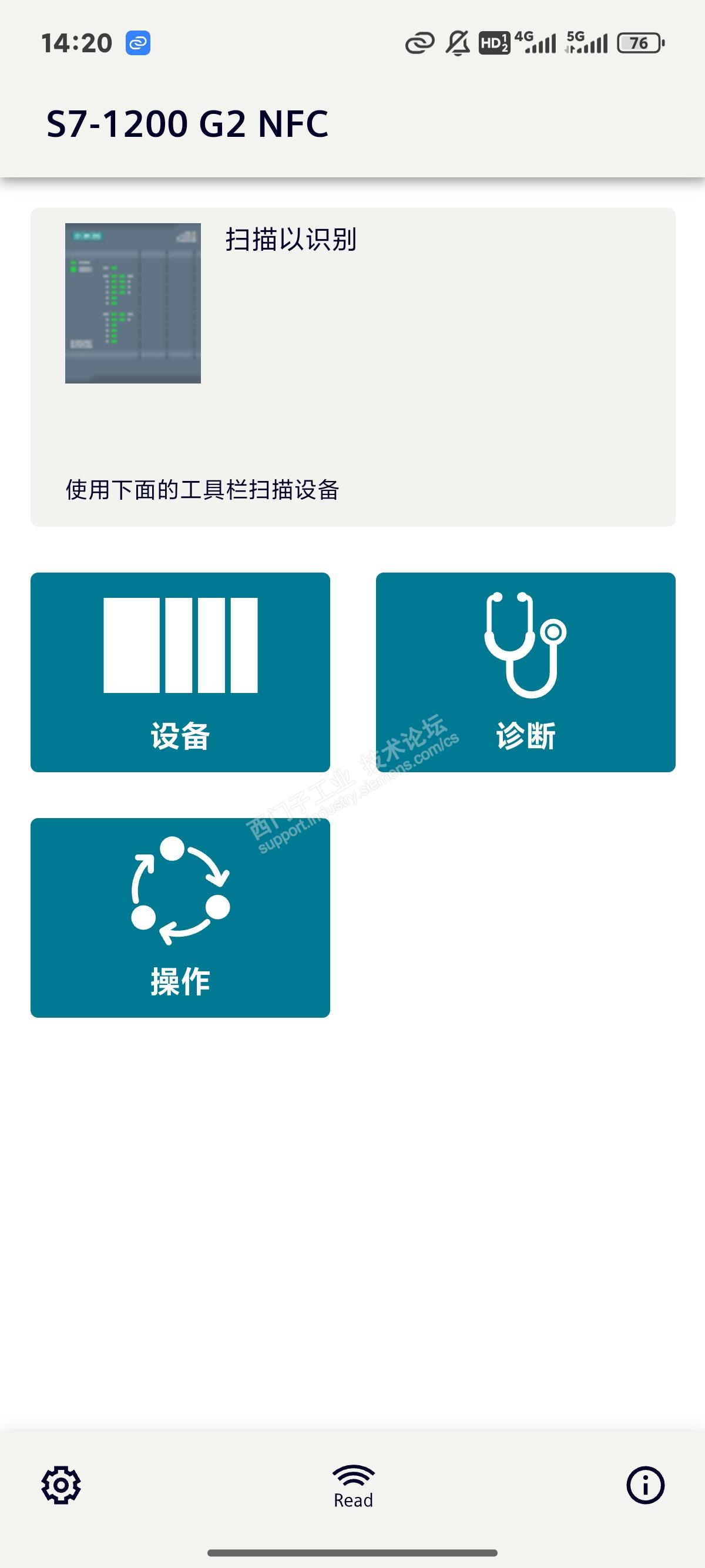 S7-1214C G2 DC/DC/DC在博图V21里开启NFC功能并完成硬件组态后下载到PLC(PLC固件为V 1.0.2)。安装应用商店下载的S7-1200 G2 APP后开启标签扫描无论在安卓还时IOS下均无法扫描到标签。PLC在线诊断也没有发现问题。想请教下各位是否哪里没有设置正确,也参考技术手册进行了排查。截图见下(另外一个模块是CM 1241 (RS232/422/485))。