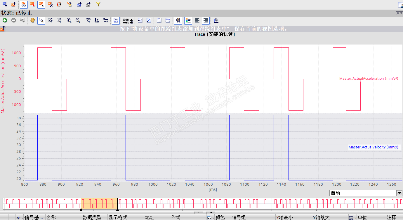 项目背景:CPU 1511T搭配V90伺服走105报文,主轴是用TM Count 2x24V 模块带的增量编码器组态位置轴做主轴引导,从轴是V90,由于主轴是变频器带的(非我司设备,抖动无法解决)速度和加速度曲线异常,现在跟随轴齿轮同步的时候也存在抖动,现在调节了V90伺服参数的位置环增益,速度环增益和速度积分时间,跟随轴抖动好转,请教各位前辈还有没有什么好的方法可以调节的。主轴和从轴曲线如下