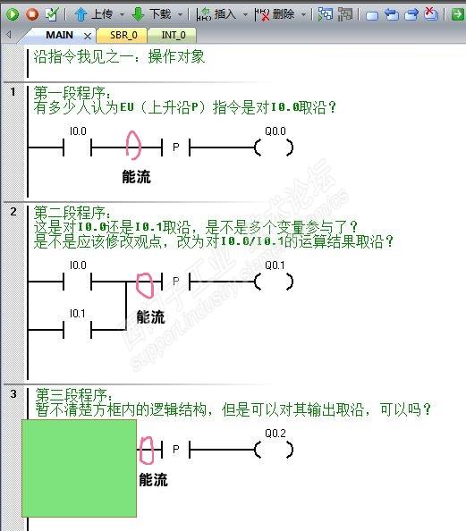 I0.0、或I0.0/I0.1的运算结果、或方框内的逻辑输出,最终都以能流的形式,送到沿指令前。