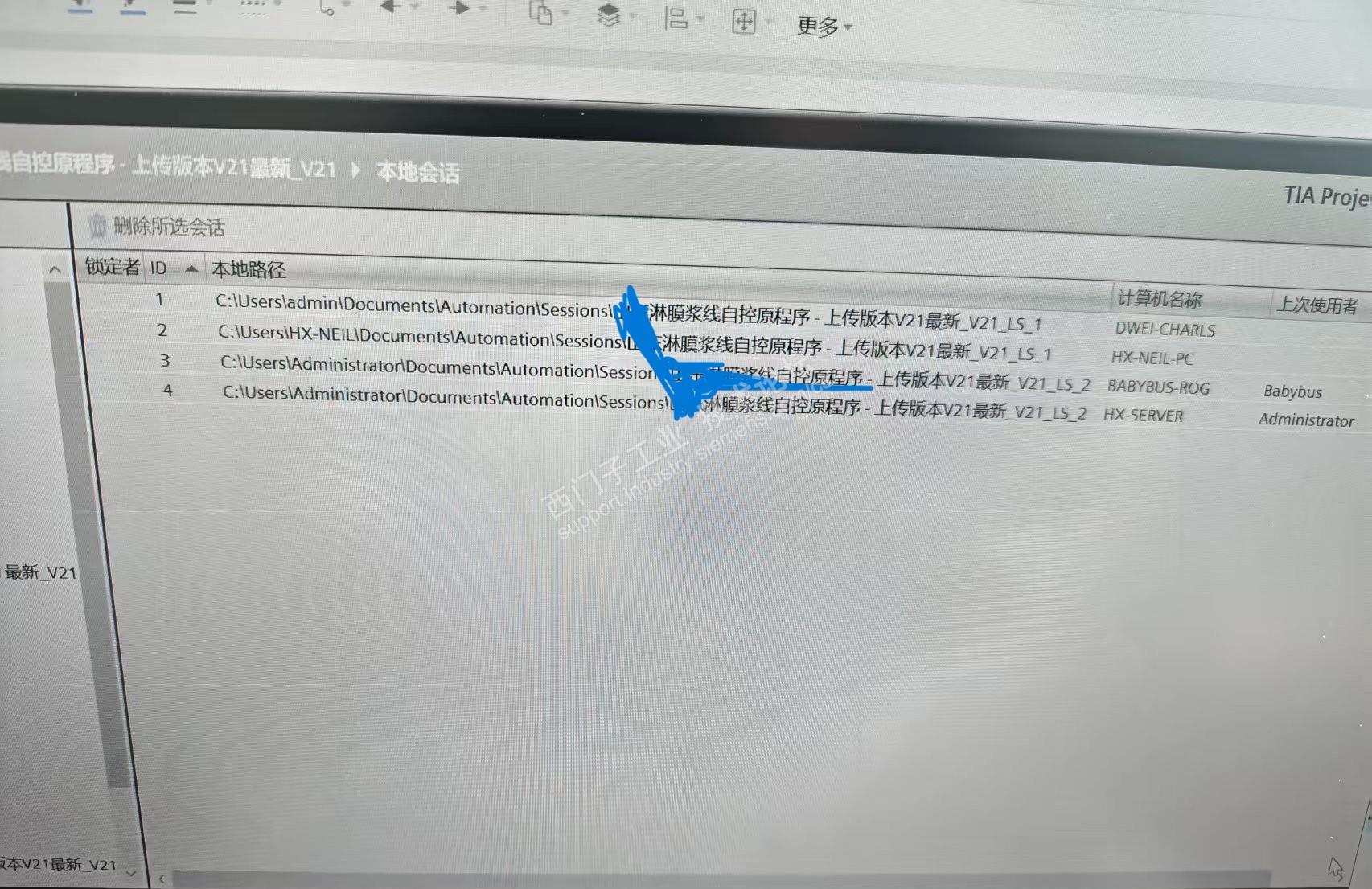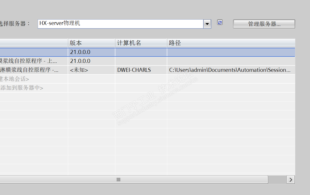 现在问题在于,通过PC1上传工程文件到服务器上,上传成功后,服务器出现了这个工程项目,然后PC1创建本地会话,显示失败,但服务器显示创建成功,PC1上的本地会话无法打开,且版本号无显示。然后在PC2上创建本地会话成功,PC3上创建本地会话和PC4创建本地会话均跟PC1上的本地会话表现一致,但服务器上显示PC1-PC4有创建本地会话的记录