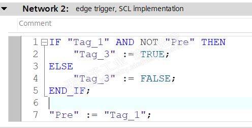图2就是把梯形图翻译为SCL语言,network 2可以实现上升沿触发,功能完全等价于network1。只是把Tag_2的名字更改为了Pre。Pre的含义就是记住Tag_1在上一个扫描周期的状态。所以在第7行就是实现这个意思用的。通过这个讨论,我们建立起了一个概念:程序是在不断的、持续不停的滚动执行。每次从头到尾的执行就是一个扫描周期。下一个扫描周期IO状态与这个扫描周期的IO状态不同,我们的PLC程序就是在应对这些状态的变化,因此演绎出千变万化的应用程序。