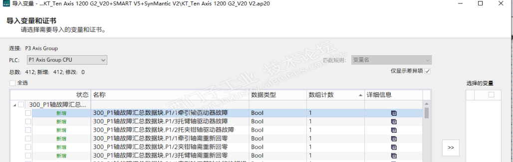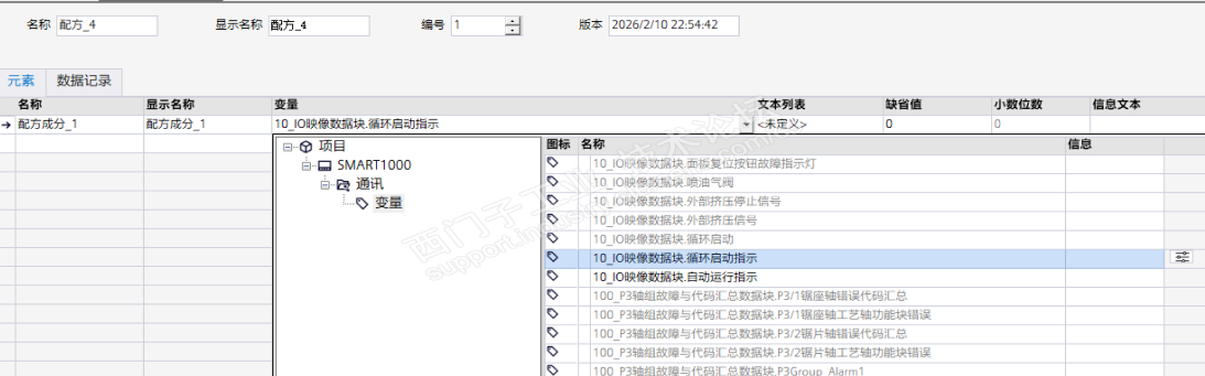 屏为SMART1000,编程软件是SMART V5 SP1,博途V20.屏的变量直接由V20导入.但在屏增加配方时,导入的V20变量为灰色,无法选择,只有极少数变量可选择.变量即使与可选择变量类型相同,也无法选择.图1为导入V20变量时的画面