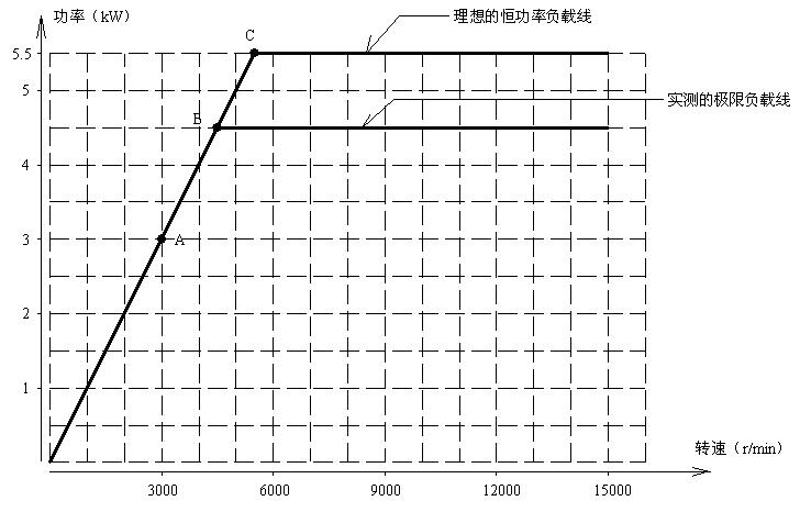 图中的A点,是该电机的铭牌数据的额定转速和额定功率点,B点,是做试验实际得到的恒转矩-恒功率的拐点,C点,是期望的理想拐点。