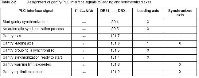可以通过主/从动轴的PLC接口获得耦合轴的特定的接口信号。下表显示了带有编码的所有龙门的PLC的接口信号,并表明了是主动轴还是从动轴。