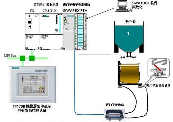 西门子新型工业称重控制系统说明:现场称重传感器,经过接线盒并联,输出的mV信号直接输入到西门子PLC称重电子模块SIWAREX系列。