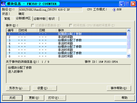 好,按照客户的操作步骤,只将FM350-2组态到机架上,不打开参数分配窗口,直接下载的程序,运行CPU后,果然FM350-2的SF灯亮了。在线监控模块的诊断信息,上面的错误信息又出现了。