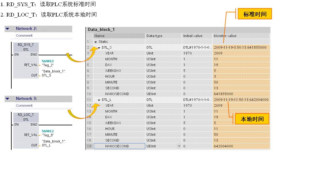 听到客户读到“SYS”,整个心放下来了,心想找到问题原因了,在客户说完后,回答道:“王工,您好,您功能块调用错误,读取本地的时间应该调用“RD_LOC_T”,而您现在用的“RD_SYS_T”读的是标准的时间(格林威治时间),是和本地差8小时。”