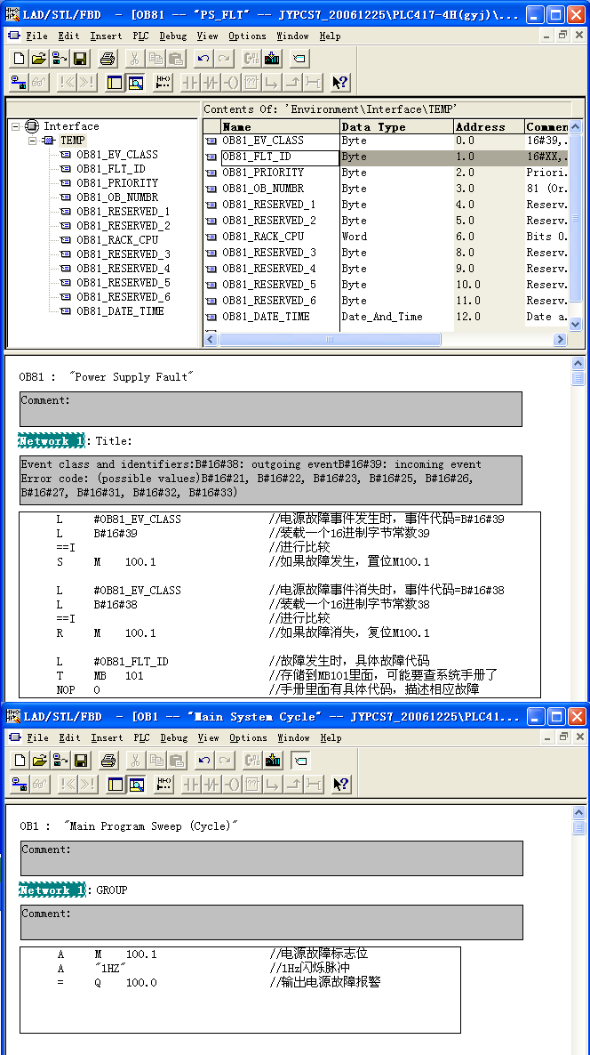 念念吥忘兄弟:很抱歉,今天才看到你的回帖,我表示歉意!首先你的CPU要支持这个电源中断功能,我记得S7-400才支持这个功能,对应的中断是OB81。它的机理是这样的:当电源(PS)有故障时,这个故障事件触发操作系统去执行OB81一次,当电源(PS)故障消失时,这个事件又触发操作系统去执行OB81一次!如果我们要知道是否PS故障了,我们可以写点程序,先在OB81里面写点:故障发生时,置位M100.1;故障消失时复位M100.1;然后把它的故障代码读下来!HMI也可以读这个地址,来作为HMI的电源故障显示!在OB1里面或其它地方也可以写点程序,可以用来作为控制柜上面的报警指示灯的驱动!如贴图:(仅供参考)