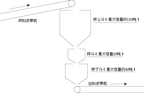 如图所示,我们将料斗秤又称三斗式流量秤,即秤上斗、秤斗、秤下斗。做为缓冲斗,秤上斗和秤下斗的容量要大于秤斗的容量,这样的设计足可以保证皮带流程的粮食计量连续工作性较好,不会受暂时供料不足而影响工作效率。