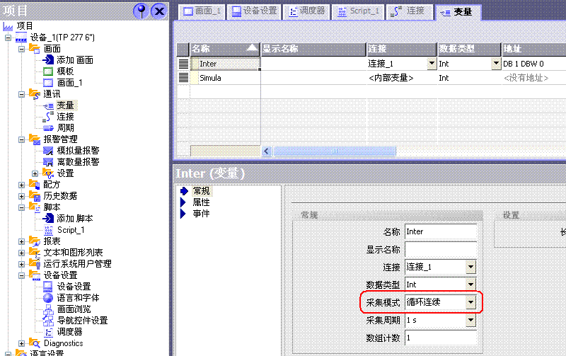 在变量“Simula”的“更改数值”事件中调用脚本“s criptTest”,同时将其采集模式设为“循环连续”: