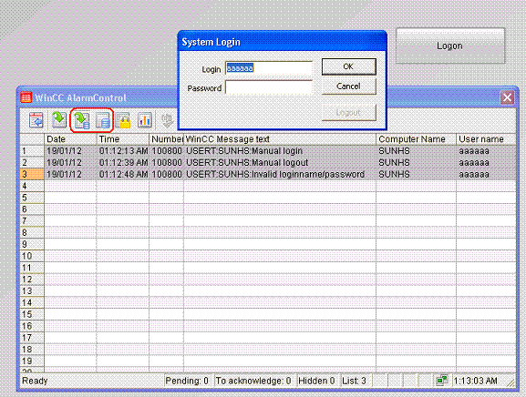 (4) 激活WinCC 项目后,可以在报警控件的短期归档或长期归档 (实时消息列表中没有)选项中看到用户登录信息的记录。
