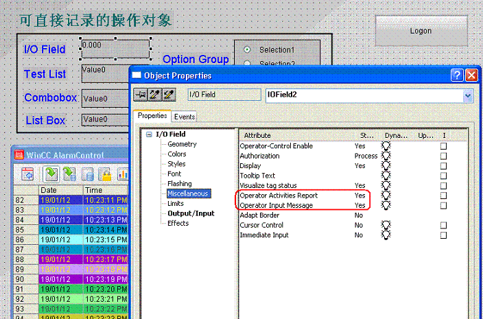可选择激活“图形编辑器”中相应对象的“操作员输入消息”属性,以记录对该对象关联变量值的变化,以下对象支持该功能(以 WinCC V7.0为例):