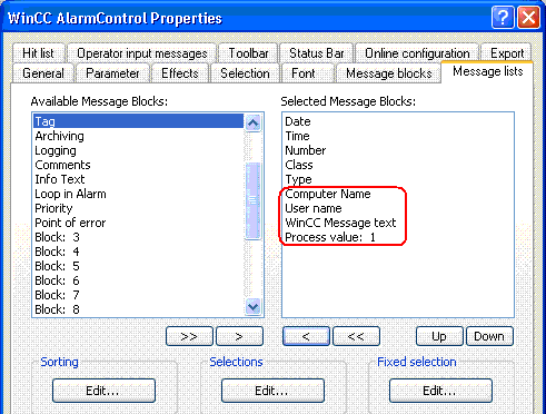 (1) 缺省状态下,操作员输入消息可包含有关登录用户和当前计算机的信息。为此,将“用户名称”和“计算机名称”系统块添加到报警记录编辑器中。 在“消息列表”选项卡中的 WinCC 报警控件上,将系统块添加到选定消息块中。