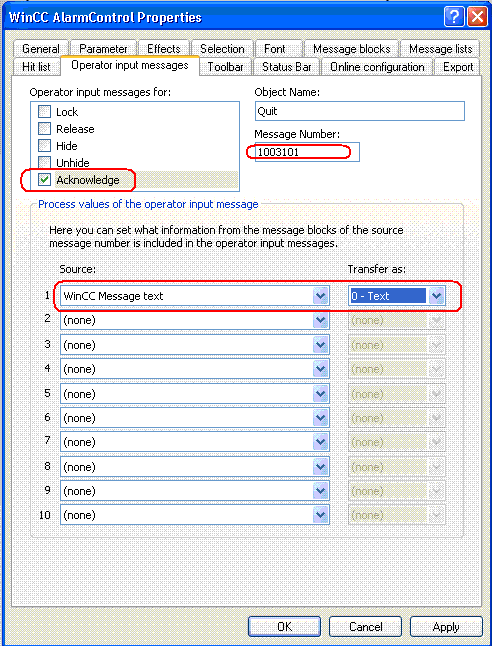 III. 将操作消息的消息块分配给操作员消息的过程值块。 这些消息块必须是“消息块”选项卡上选择的消息块(此处将编号11消息的用户文本块1,即WinCC Message text传送给操作员消息1003101的过程值块1)。