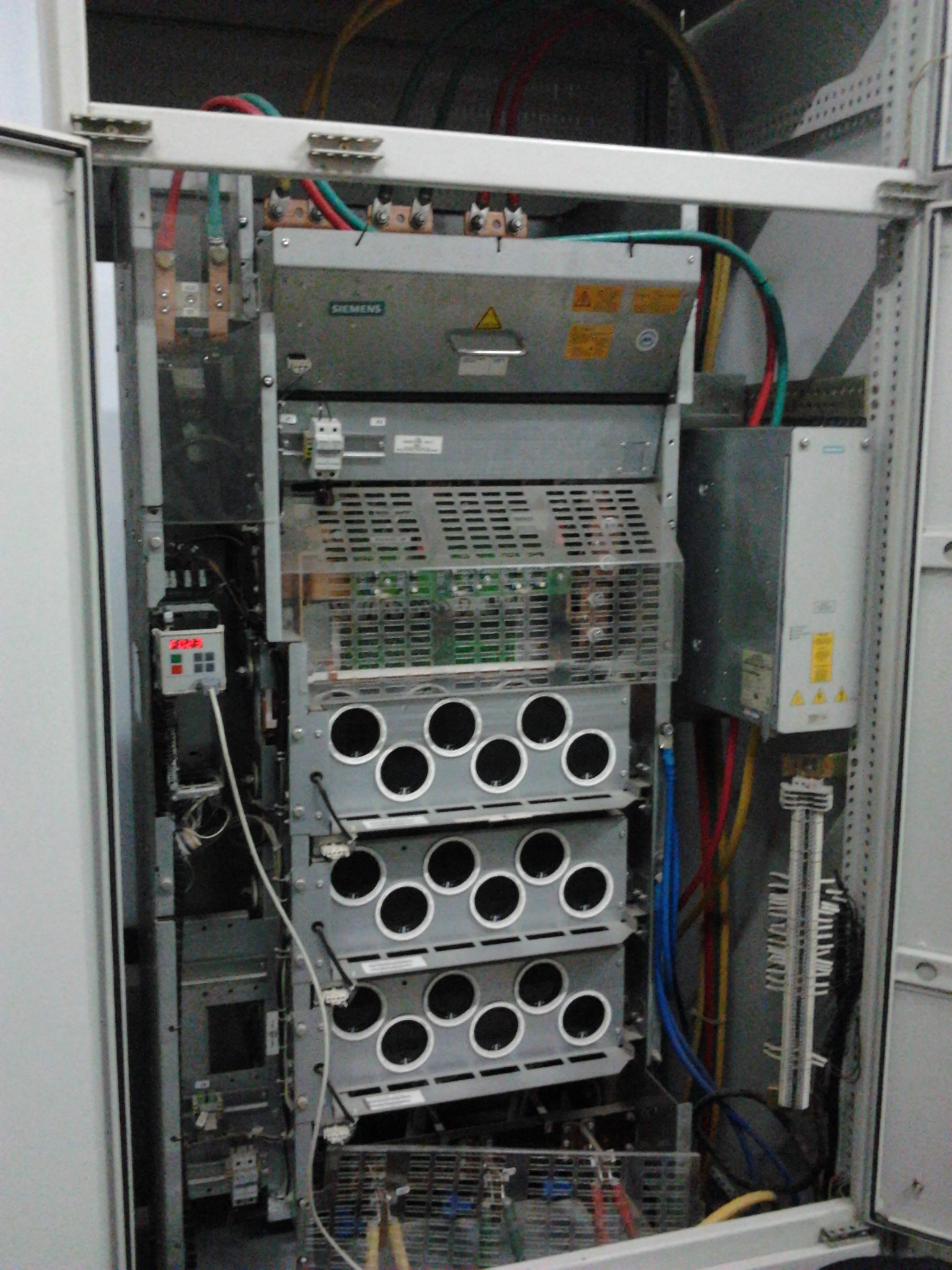 到现场后,装机柜型250KW的70变频器居然如此大个,有点露怯了,呵呵~现场的技术人员对70变频器还比较熟悉,说已经更换过CUVC试了,故障依旧。现场温度正常室温,排除了温度过高的可能,那肯定就是检测回路出问题了,结合来前咨询的XD公司的相关人员,以及从网上搜的资料说有电阻类的损坏,肯定是检测回路的板子出问题了。那就再拆吧,好在西门子的变频器都是模块化易拆卸的,拆惯了MM4系类的变频器,70 的也基本一样:先把CUVC拆下来,再把背板拆下来,发现插在背板上全是电阻的小板,插接处锈迹毕竟严重,怀疑是他的问题,于是从另一台变频器上把改板拆过来试了,结果还是F023。背板检查了下,没有可能损坏的元器件。