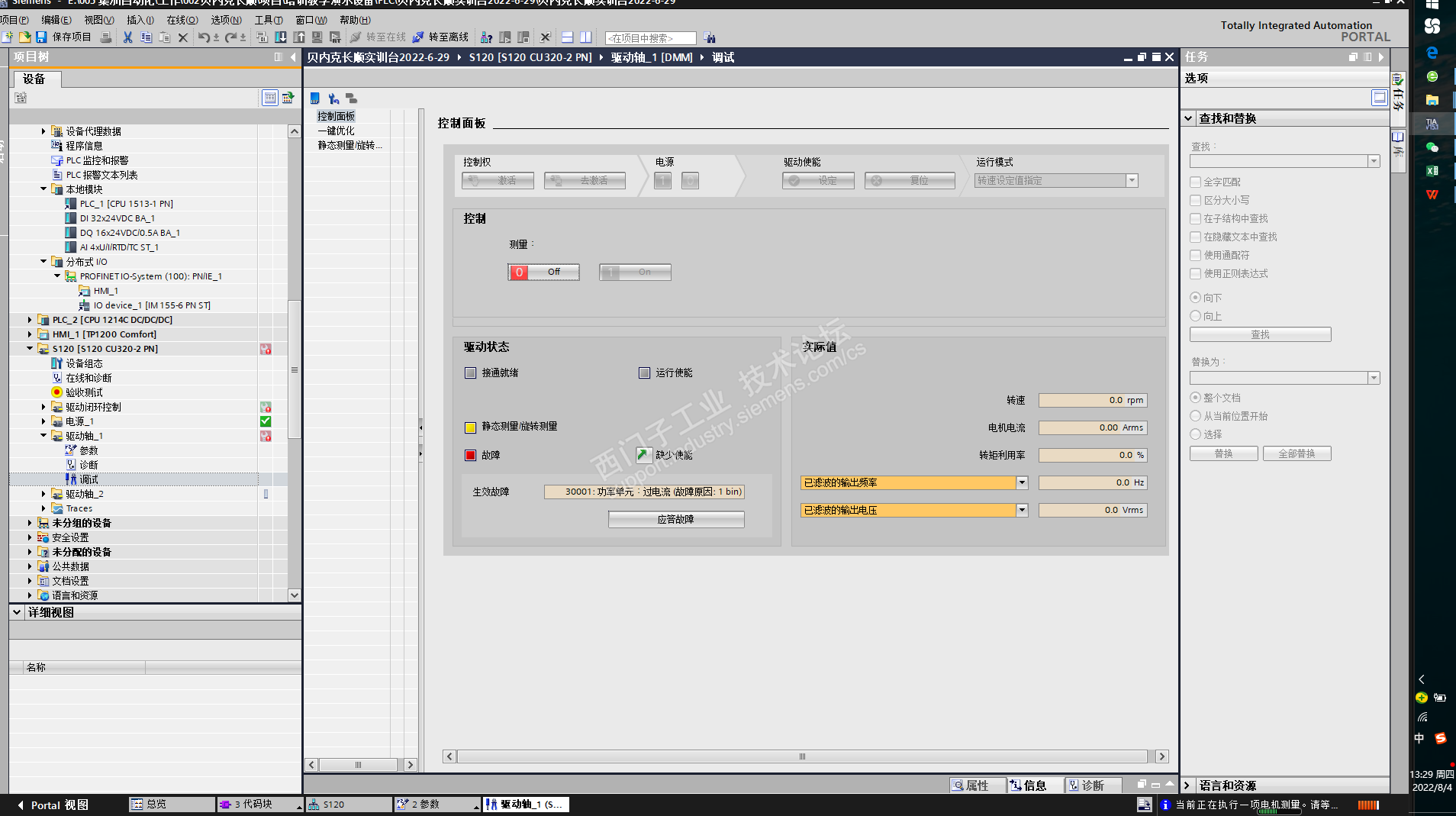 2、配置通过博途V15.1进行硬件组态,在通过驱动器调试的时候,用开环控制,可以控制电机旋转,但一旦选择编码器模式,就会出现故障报警 7995 (42)检测磁极错误。(图2)