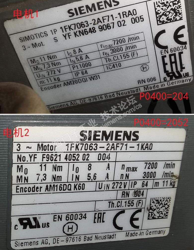 1、CU320-2PN,控制电机型号:1FK7063-2AF71-1RA0,查看CU参数P00400=204