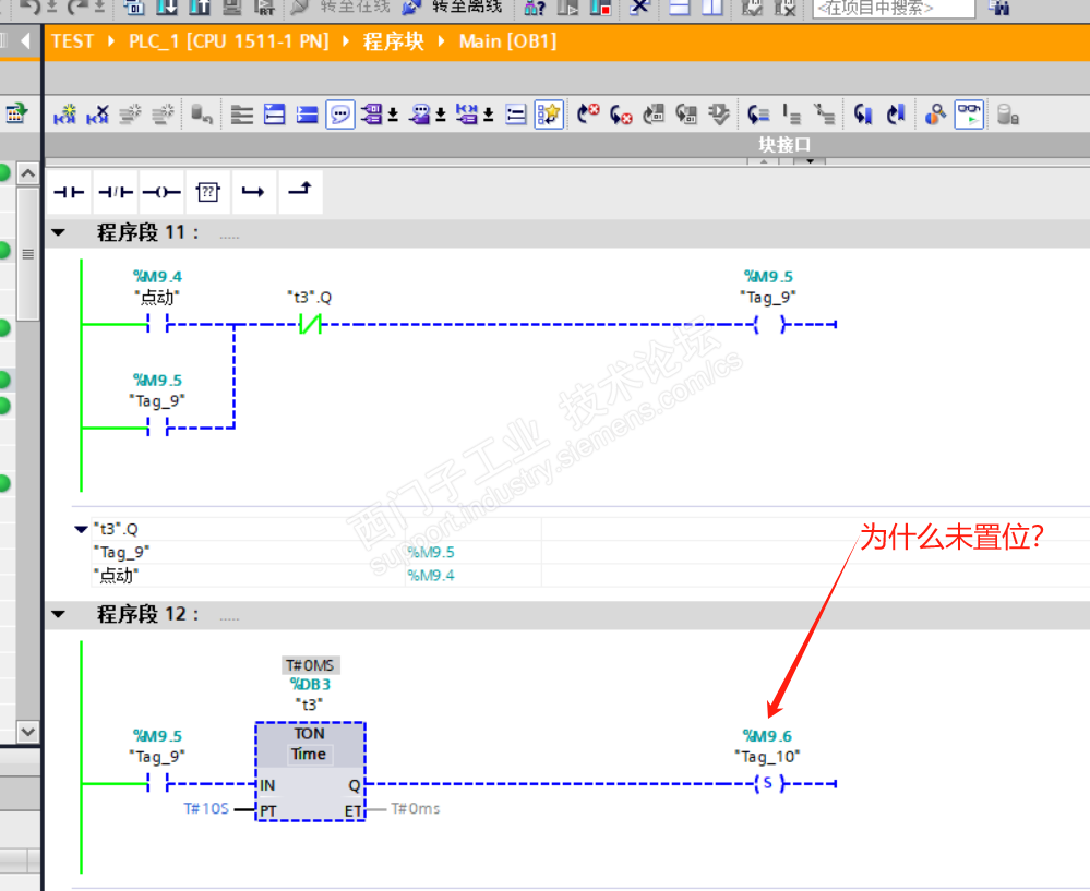 点动按钮按下后,M9.5置位,T3延时10S后导通,M9.5复位,但M9.6却未置位。什么原因?按照程序从上到下、从左到右,M9.6应该置位呀?求高手帮忙解答一下,谢谢!!network1与2互换则可以。