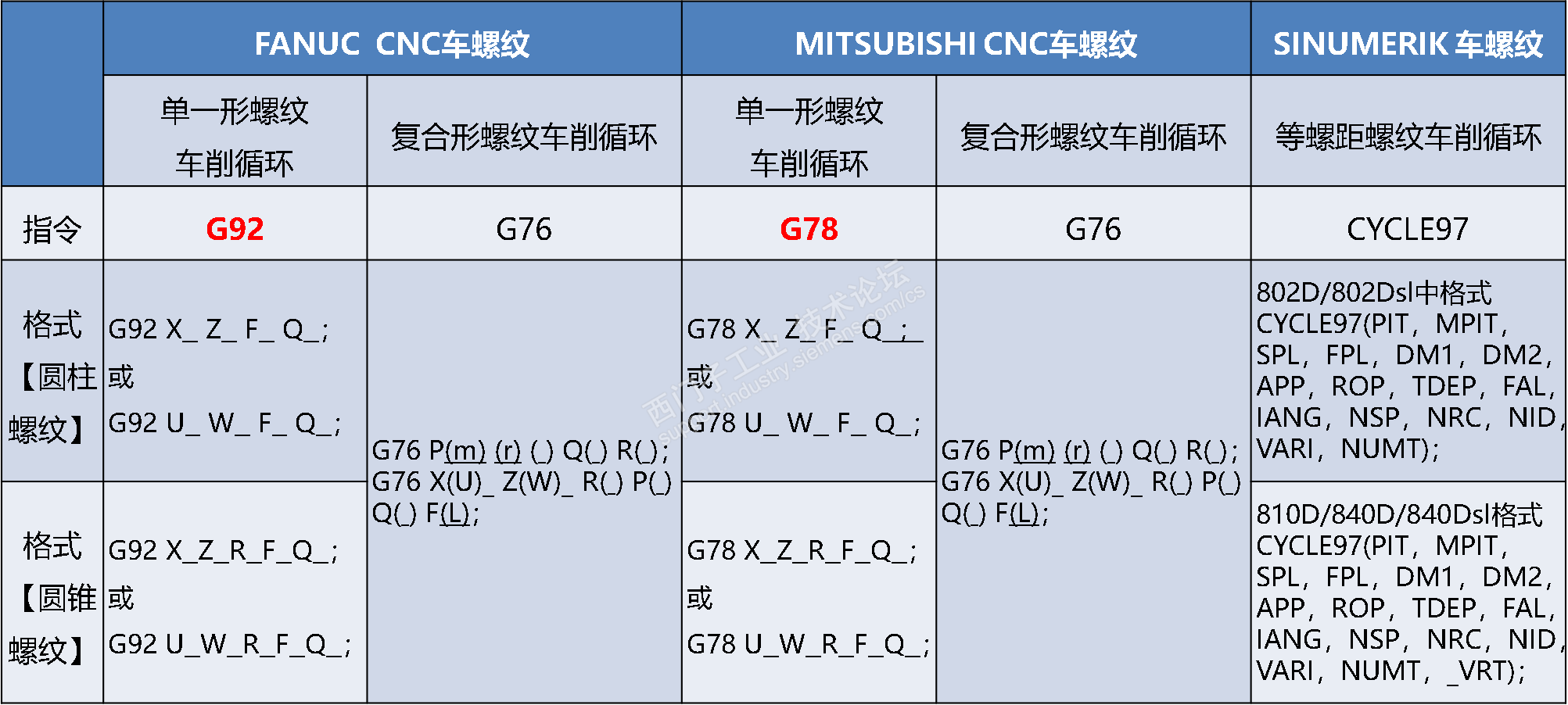 这是发那科、西门子和三菱 3种系统的等螺距螺纹指令对比。