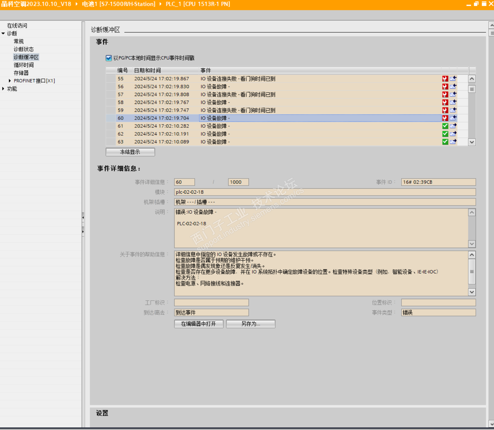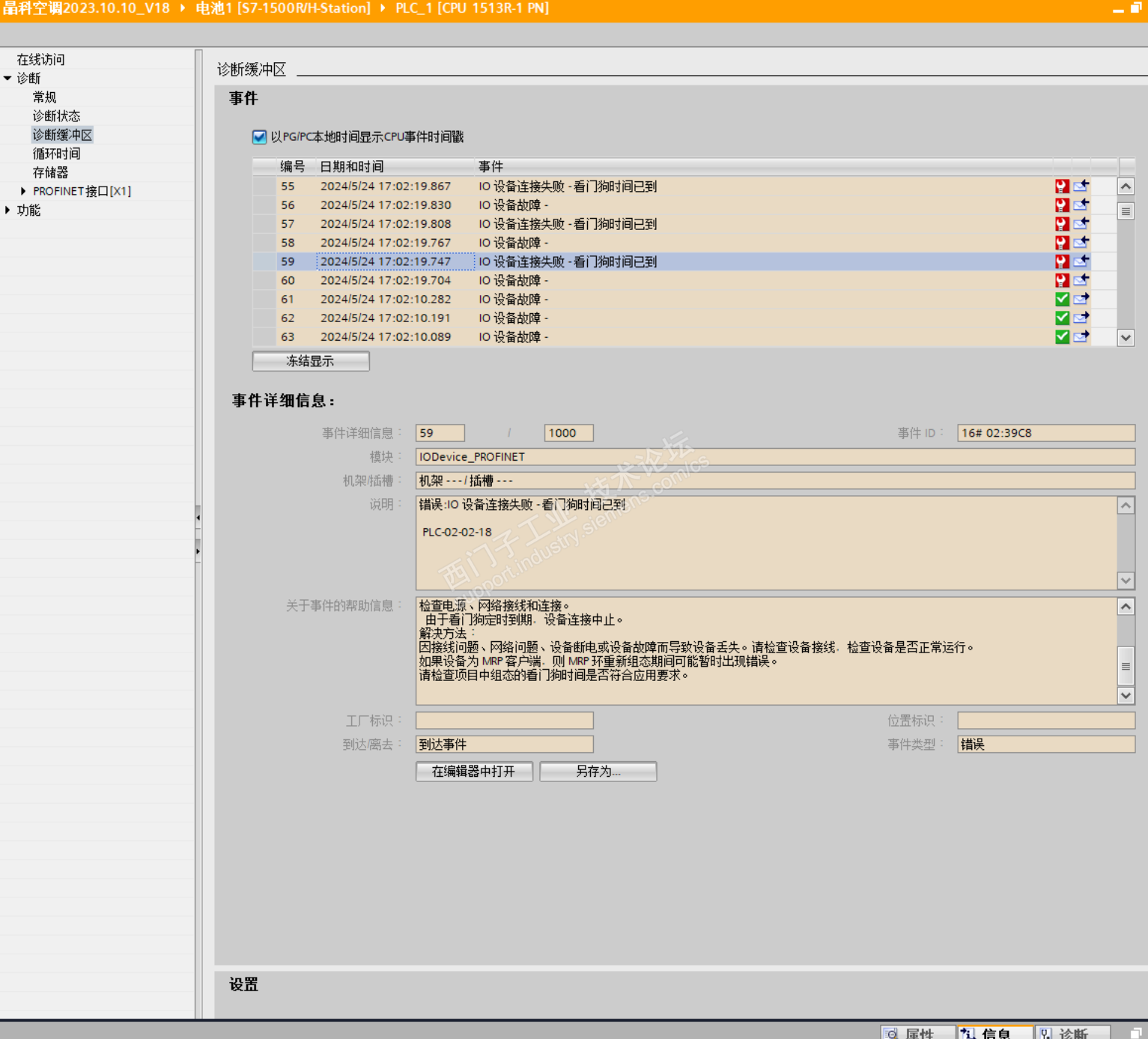 1513r冗余系统plc,连接et200sp模块,模块会突然掉线几秒钟,又重新连接好,在线诊断故障,掉线的模块报错IO设备故障和IO设备连接失败,看门狗时间已到