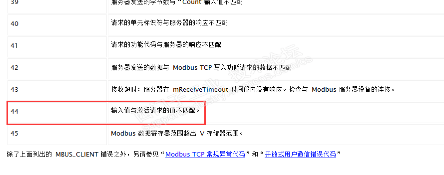 PLC作为客户端,PC的Modbus Slave软件作为服务端;客户端发送读写命令,每次运行一段时间后都会出现错误代码44:输入值与激活请求的值不匹配。这是什么原因?输入值是什么?激活请求是什么?