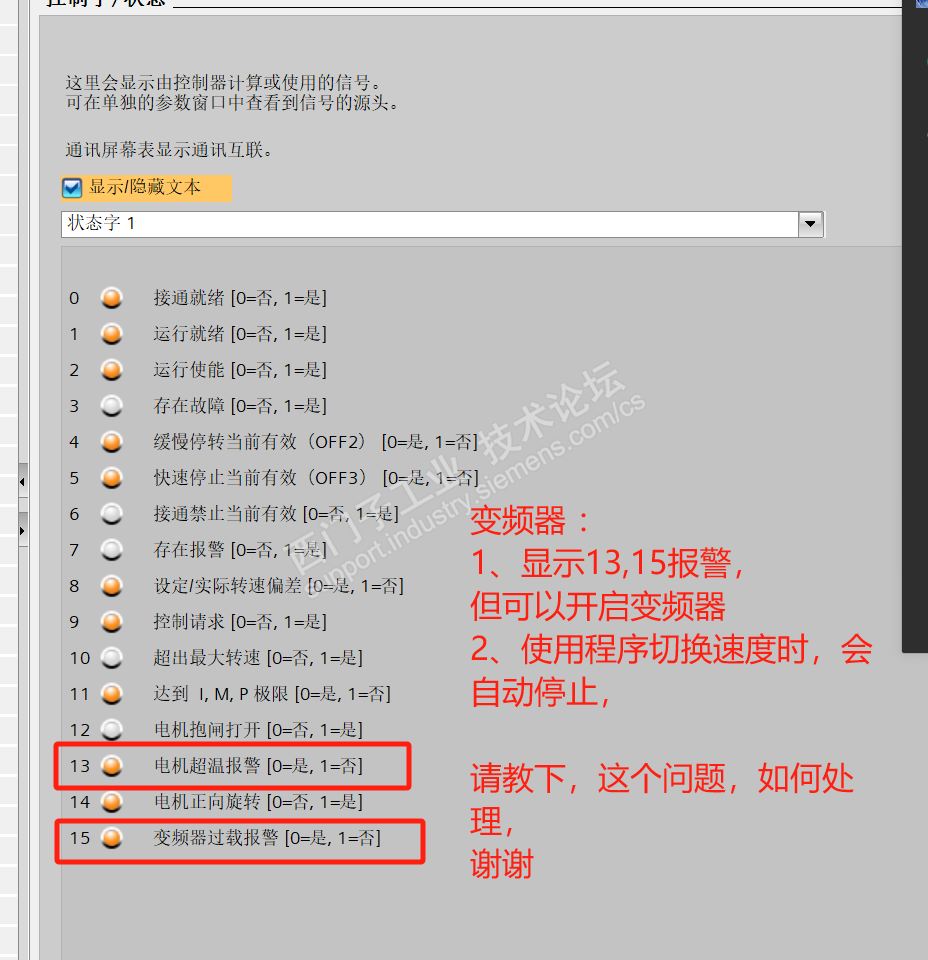 另外,状态字的,电机超温报警,和 变频器,载报警,一直点亮,但是也不影响运行,请问,这个问题,如何解决。