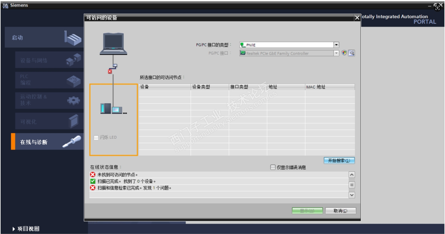 在博途V16中,查找可访问设备,显示无法找到可访问设备