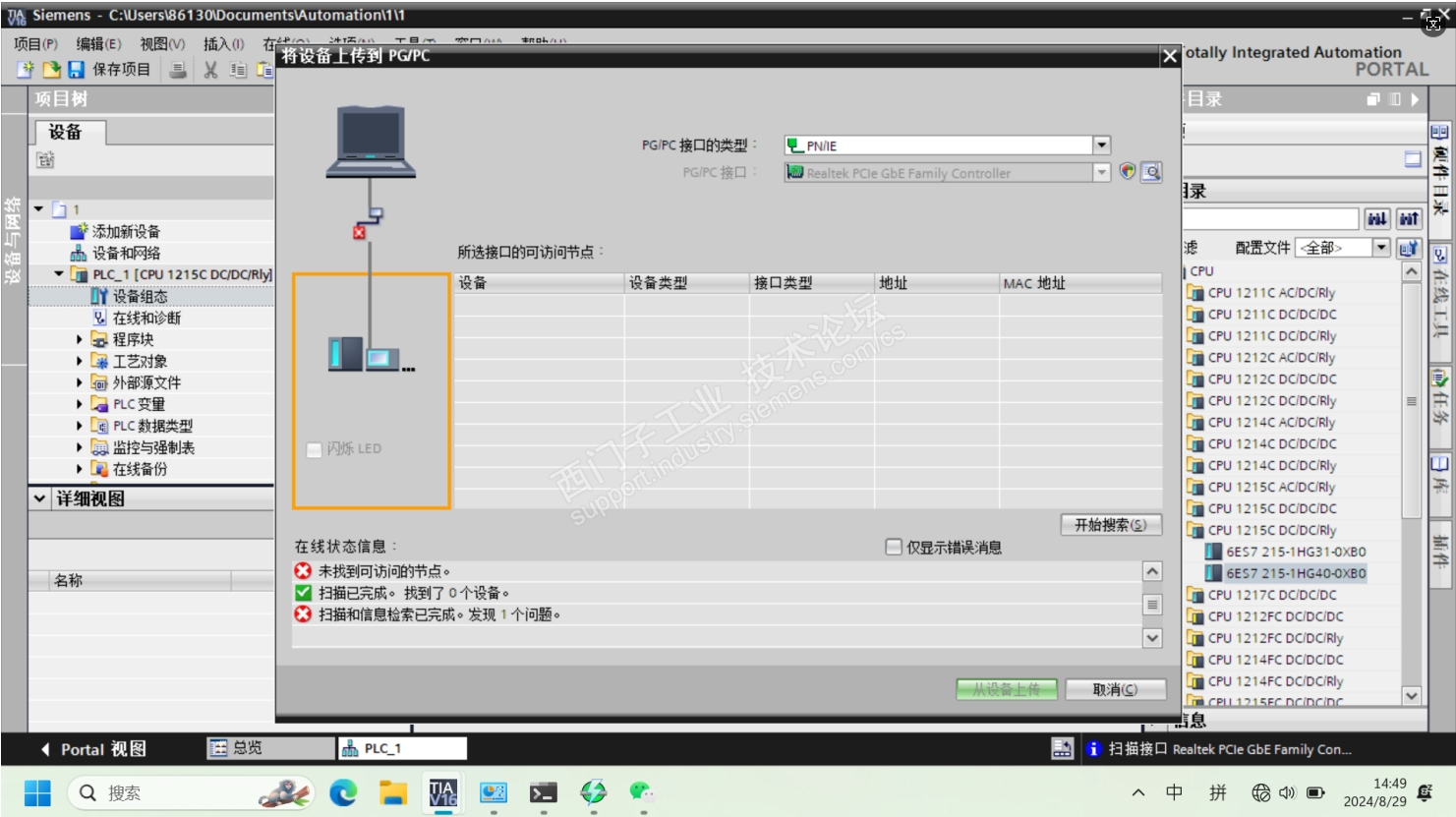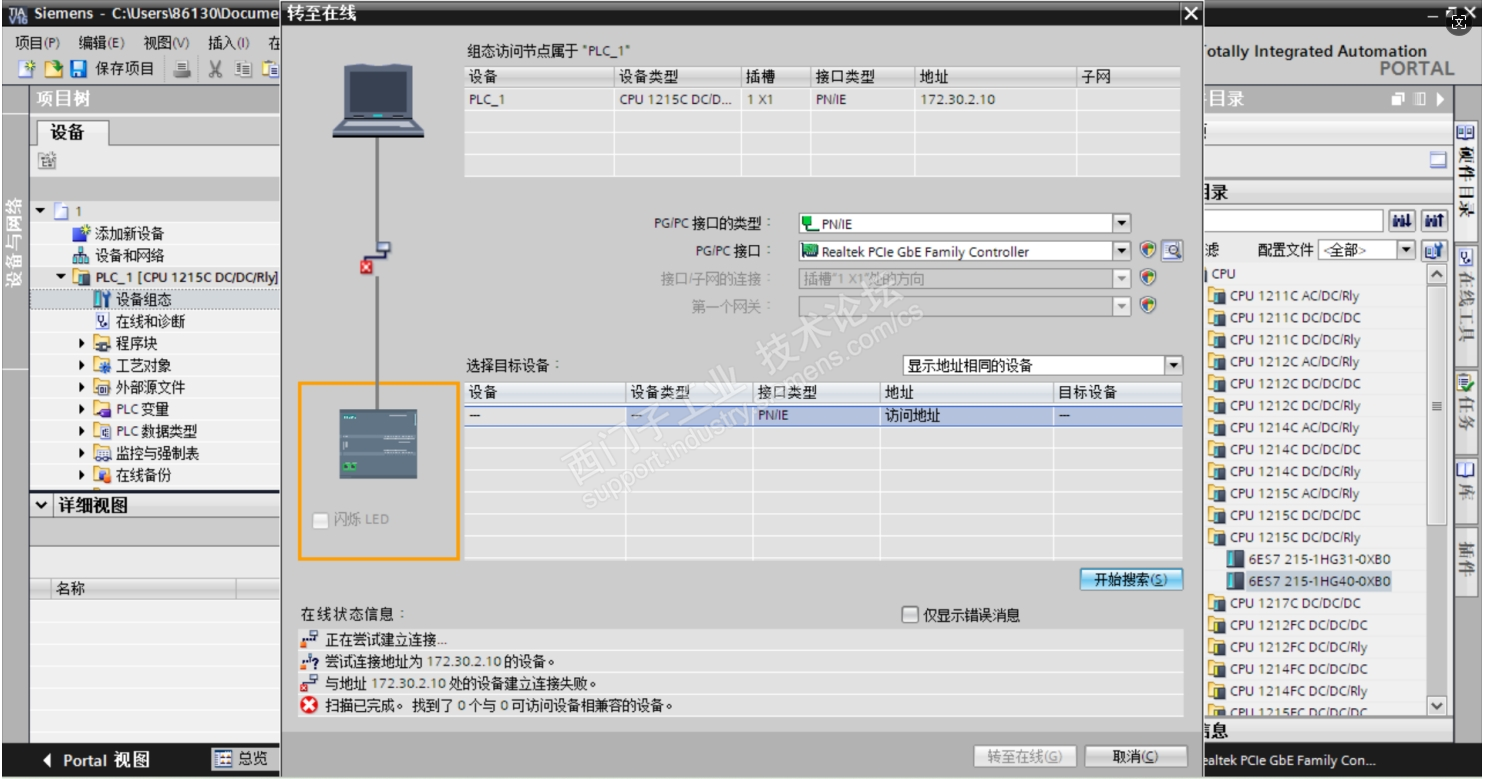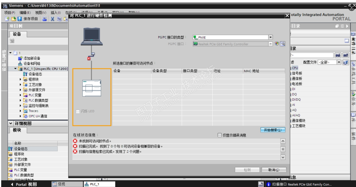 添加一个空白的1200CPU,选择获取设备,也无法找到设备