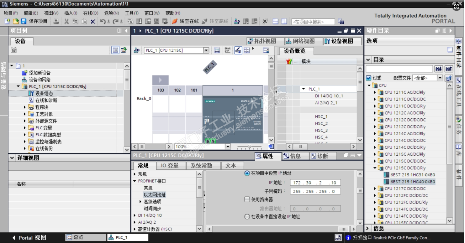 PLC的型号为1215C;IP地址为172.30.2.10。