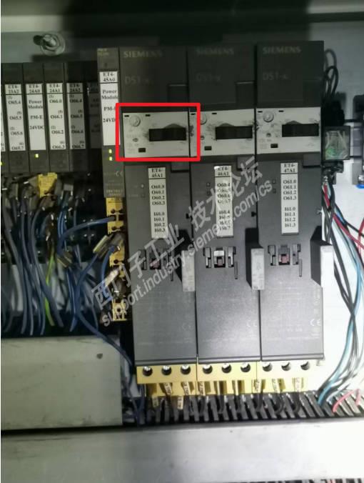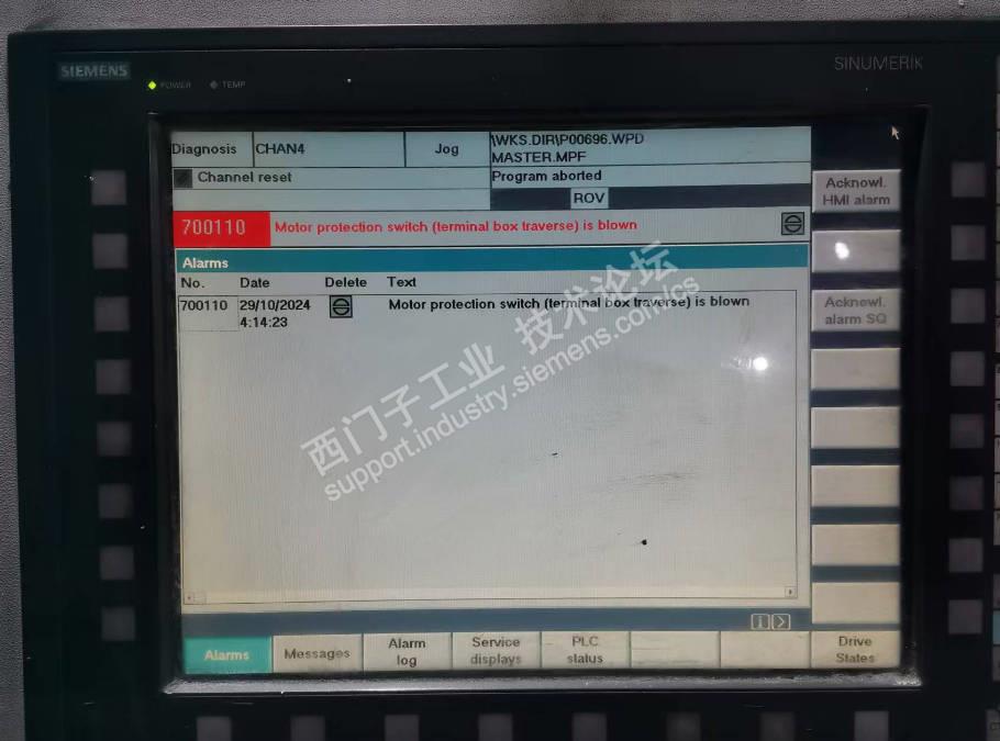 报警700110#故障,报警说明为系统主轴主驱电机强制风冷电机断路器没有合上。故障描述部位非常清楚,到远程站点控制柜打开检查,确实有一个电机驱动器断路器开关跳闸了,图示: