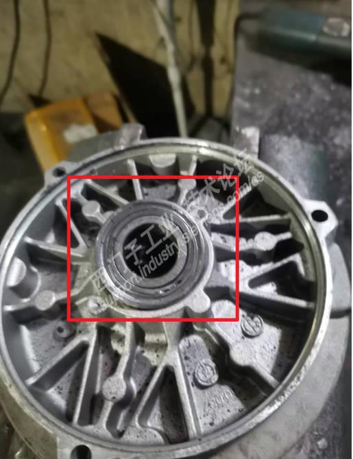 在主轴主驱电机上方,拆下这个风机电机,用手盘风机风叶有一些阻尼,用力拨动风叶能够转动,至少说明电机轴承不灵活了。吹扫电机表面灰尘后,将电机风叶拆下,拆下电机前轴,固然这个电机的前轴承已经卡死发热,轴承表面颜色已经发黑,手转动能够转动是该前轴承走外圈,才使电机勉强转动,如果能够测量工作电流的话,应该是严重超负荷运行的工况了,图示: