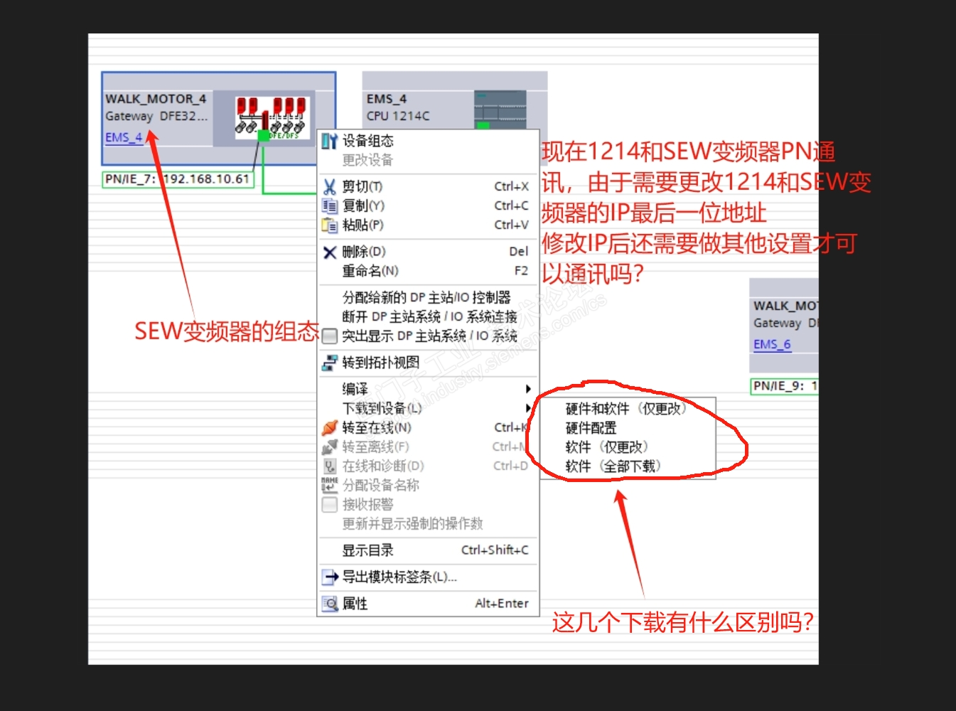 如果我在博图里面改下图的SEW变频器的IP地址而已,那么下载的时候选择硬件和软件,硬件配置,软件这些有什么区别?