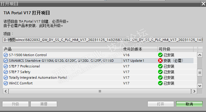 请教一下,博图V18打开V17.zap17文件时显示此文件由V17创建,由于必须产品未安装,无法升级。显示缺了V17 update1,而且无法清理。如果只下载V17 update1并安装,不安装V17,可以打开这个文件吗?或者能否把这个sinamics startdrive清理掉?
